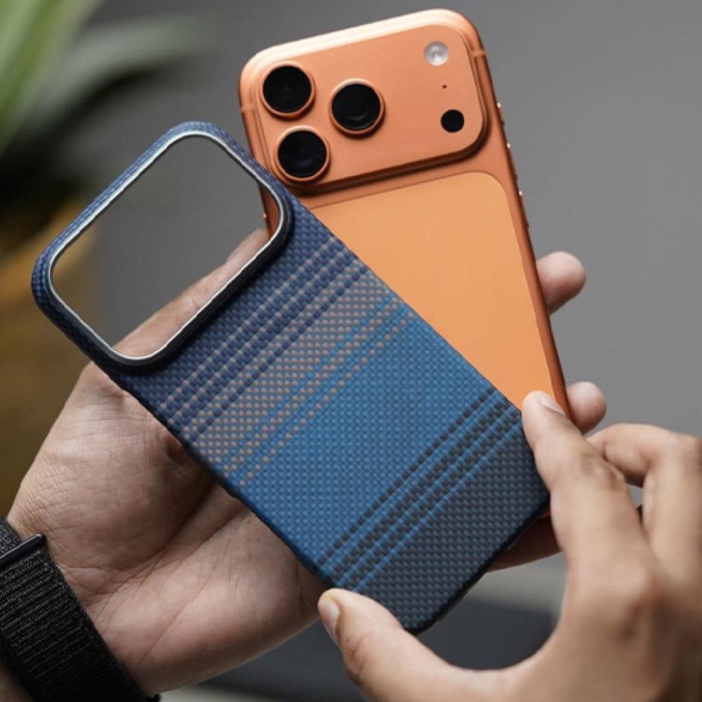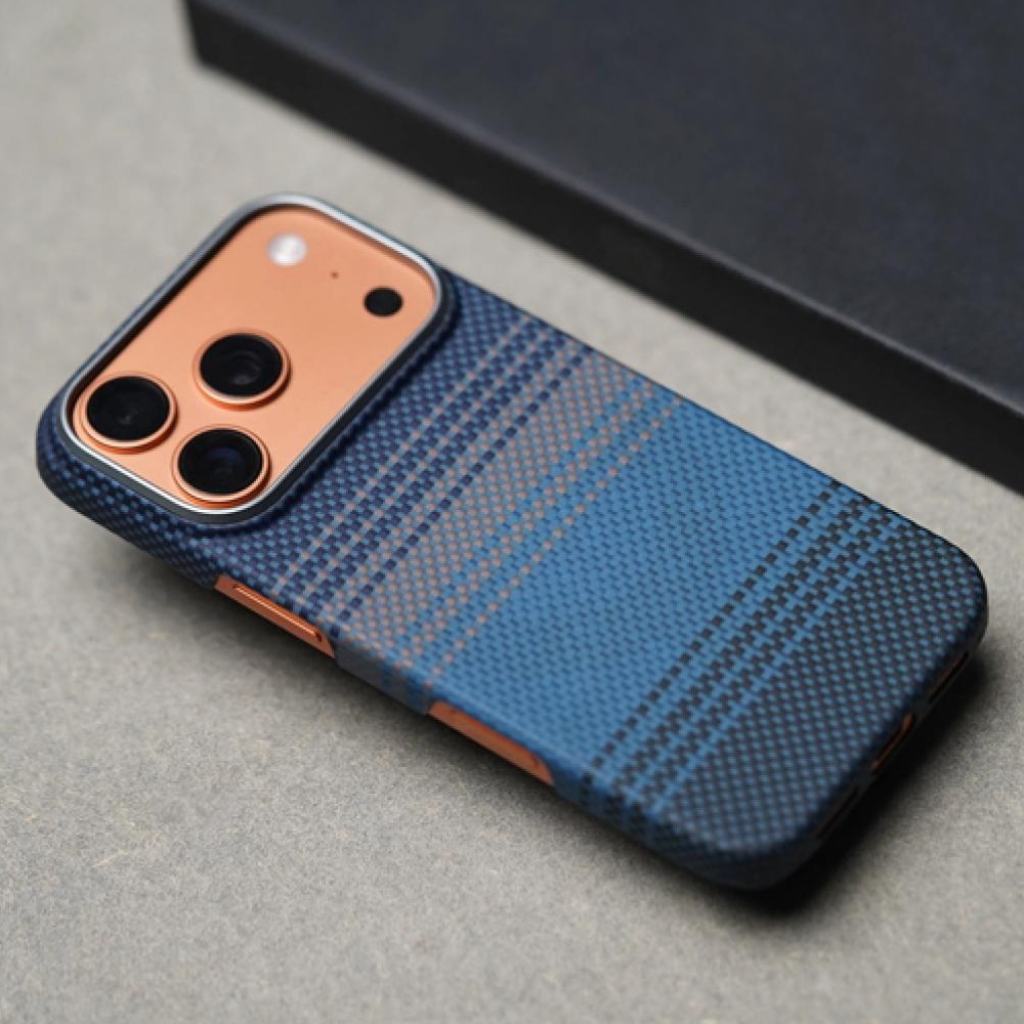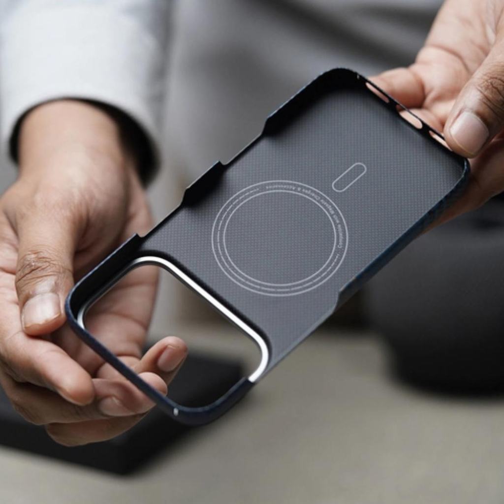 Lightweight and durable Dune Blue aramid fiber case. Features MagSafe compatibility, enhanced grip texture, raised camera edges, and aluminum lens protection — built for premium style and everyday performance.
